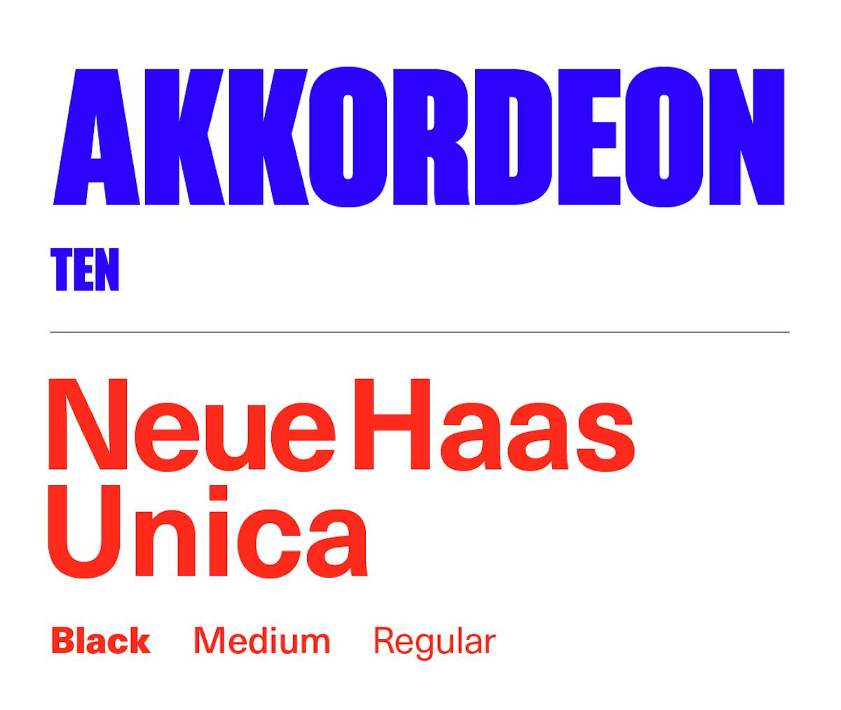 Akkordeon Ten is loud and proud. It brings a strong, commanding attention to headlines and important callouts. Neue Haas Unica is a workhorse typeface that can be used from large sub-heads to small legal copy.