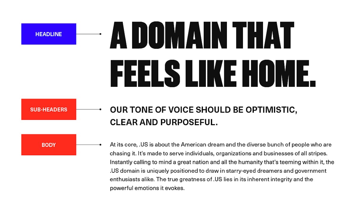 The .US voice is optimistic, clear and purposeful. It can include patriotic elements as long as it’s balanced with clarity and humility. We wanted the target audience to feel motivated and uplifted – to evoke a sense of community, connection and hope.